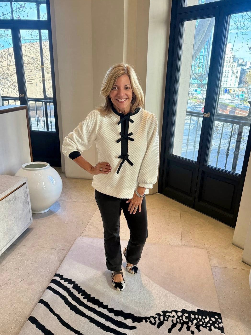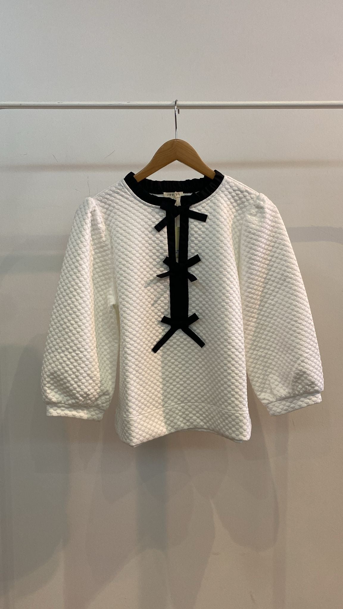 White long sleeve top with bow details.